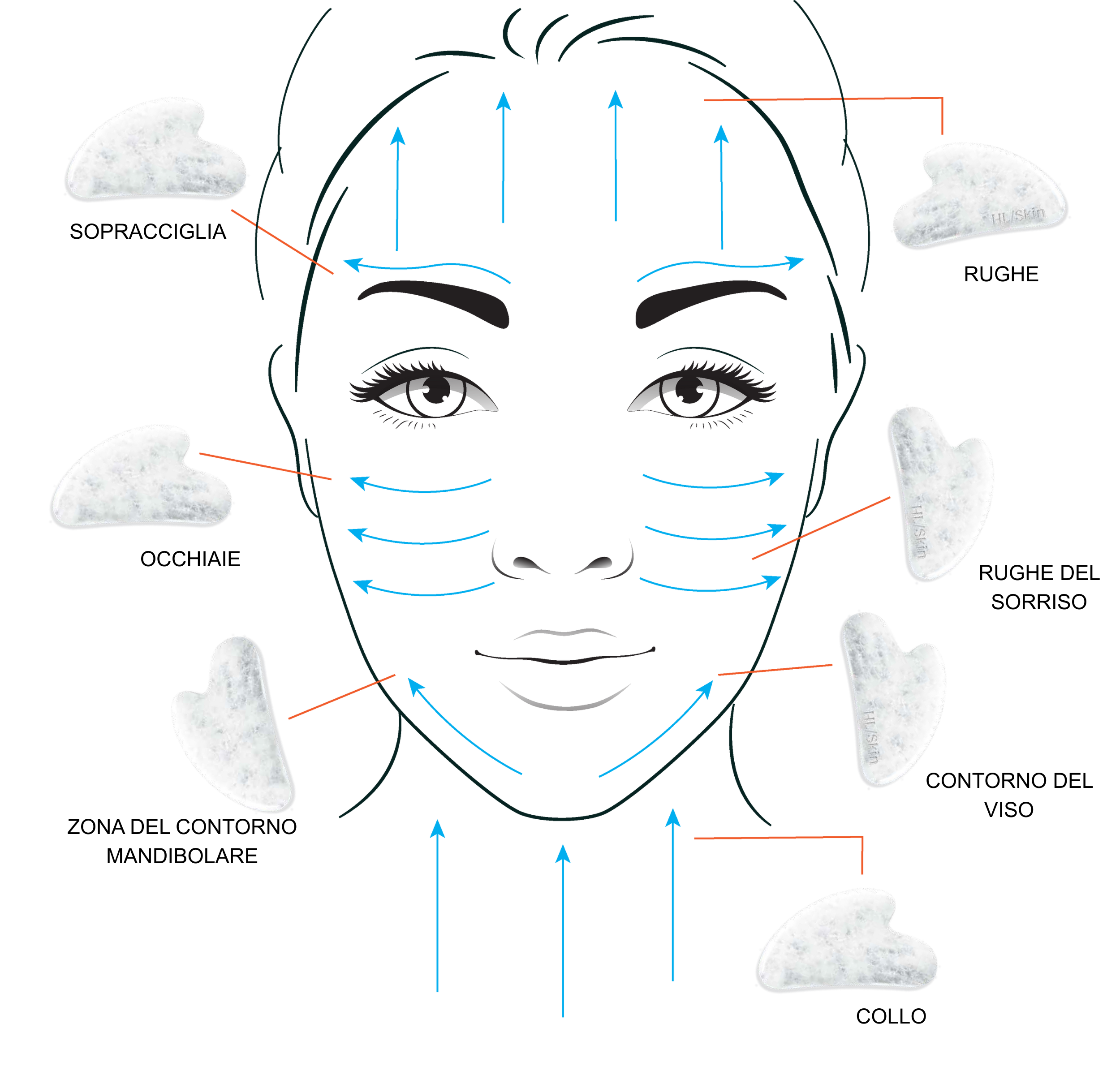 Tieni il Gua Sha inclinato tra i 15 e i 45 gradi rispetto alla pelle e muovilo seguendo le linee illustrate nell’immagine.