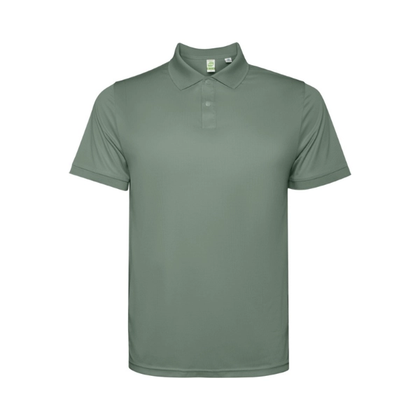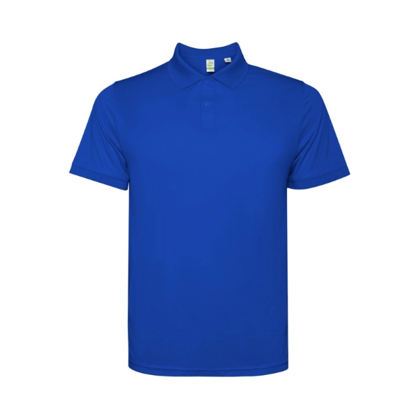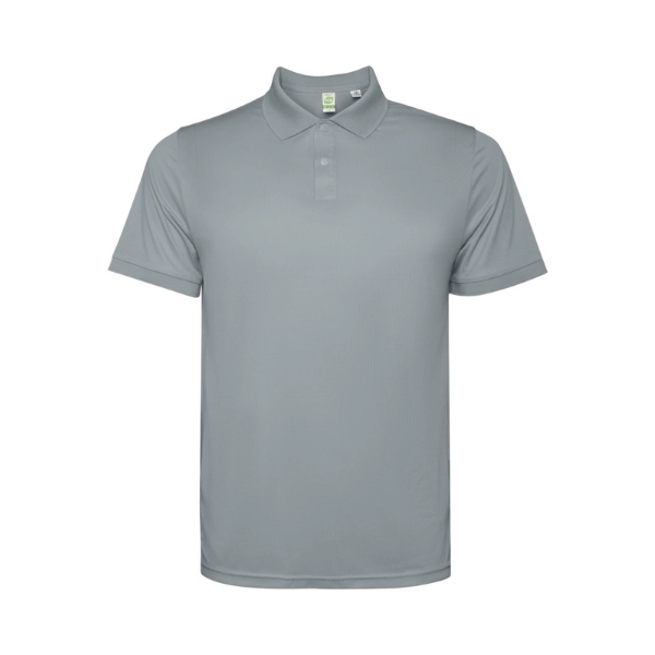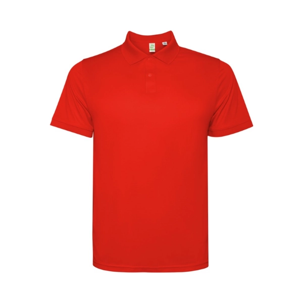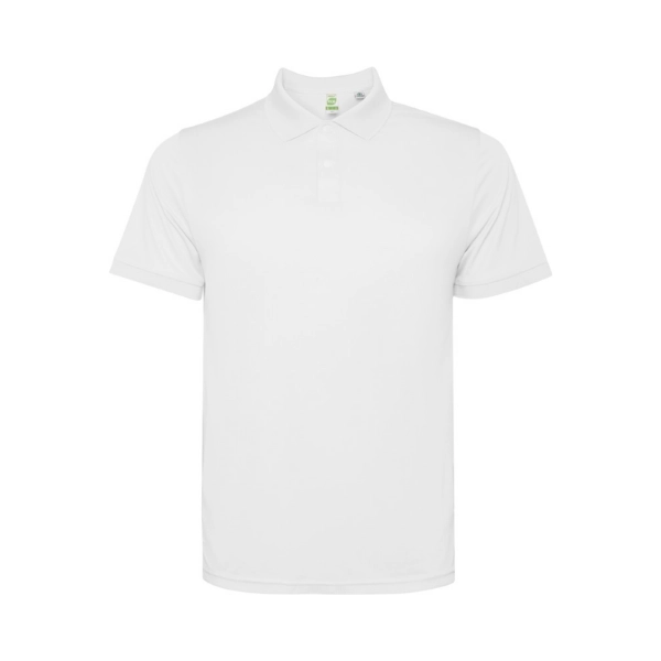 Short-sleeve polo shirt for men. Reinforced covered seams in interior collar. 1×1 ribbed cuffs and collar. Side seams. 3-button placket and side slits. Interlock knit of 100% Recycled Polyester, 120 g/m2.